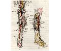 小腿后区有浅、深两层肌肉。浅层肌为小腿三头肌,深层肌有三块,即胫骨后肌、趾长屈肌和长屈肌。在浅、深两层肌之间有二条动脉及一条神经,即:胫后动脉posterior tibial artery 、腓动脉和胫后神经tibial nerve。神经于二动脉分叉后越过胫后动脉浅面,并在二条动脉之间下降,三者贴附于骨平面,在胫骨后肌筋膜深面,肌内、外缘及其中间下行。至小腿下端,神经趋向胫侧血管进入踝管,而腓动脉独自进入外踝下方。