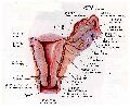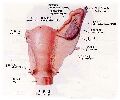 子宫呈倒置梨形,前后略扁,可分为底、体、颈三部。上端向上隆凸的部分叫子宫底。下部变细部分叫子宫颈,底与颈之间的部分叫子宫体。底、体内的腔叫子宫腔;子宫颈的内腔叫子宫颈管,上口叫子宫内口,通子宫腔;下口叫子宫外口,通阴道。