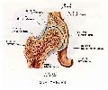 由股骨头与髋臼相对构成,属于杵臼关节。髋臼内仅月状面被覆关节软骨,髋臼窝内充满脂肪,可随关节内压的增减而被挤出或吸入,以维持关节内压的平衡。在髋臼切迹上有髋臼横韧带,并与切迹围成一孔,有神经、血管等通过。关节囊厚而坚韧,下端前面附于转子间线,后面附于转子间嵴的内侧。所以股骨颈骨折时,根据其骨折部位而有囊内、囊外或混合性骨折之分。髋关节周围有韧带加强,主要是前面的髂股韧带,下部有耻骨囊韧带,关节囊后部有坐骨囊韧带。关节囊纤维层环绕股骨颈的中部,称为轮匝带。髋关节为多轴性关节,能作屈伸、收展、旋转及环转运动。