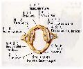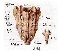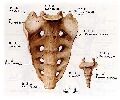 骶骨呈三角形,分底、体、尖,前、后面,两侧缘。底向上,尖向下。前面凹,有4条横线和四个骶前孔。后面凸,有四个骶后孔,骶外侧嵴,骶中间嵴,骶下中嵴。中部有骶管,并与骶前孔和骶后孔相通,骶管后下端敞开叫骶管裂孔。骶骨体上面前缘突出,叫岬。两侧及关节面,叫耳状面。耳状面的后方骶骨粗隆。
