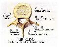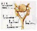 椎弓 vertebral arch在椎体后方,与椎体相连的部分叫椎弓根,稍细,上下各有一切迹,下切迹较明显。相邻椎骨之间在椎弓根处形成椎间孔intervertebral foramina。椎弓的后部呈板状,叫椎板。椎体和椎弓共同围成椎孔vertebral foramen,24个椎骨的椎孔连成椎管vertebral canal。椎弓上有七个突:向后方伸出的一个叫棘突spinous process;左右各伸出一个横突transverse process;椎弓上下各有一对突起,叫上、下关节突superior and inferior articular processes。