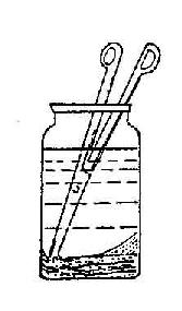 (1)无菌持物钳(镊)应浸泡在盛有消毒溶液的无菌广口容器内,液面需超过轴节以上2-3cm或镊子1/2处(图5-7)。容器底部应垫无菌纱布,容器口上加盖。每个容器内只能放一把无菌持物钳(镊)。