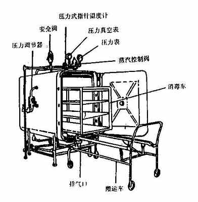 操作方法如下:打开蒸汽管道阀门,首先将柜室夹层和管道内的空气和积水排净,使夹套内达到预定压力和温度(104-167℃),将待灭菌物品装入柜室,关紧柜门。柜室内抽负压至2.6kPa,向柜室内输入蒸汽,将控制阀移至“消毒”的位置。随后机器按一定程序自动运行,诸如:“恒温”、“排气”、“干燥”、“关闭”等。待恢复常压后打开柜门取出物品。灭菌时使压力达206kPa,温度为132℃,维持4-5分钟。