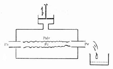图3-9以简单模型说明血管内外压力对血流的影响。模型中央为一根有弹性可压缩的细管,用以代表毛细血管。它周围有一定压力影响,即相当肺泡压(Palv)。灌注压(Ppa)相当于肺动脉压必需超过所有的下游的压力,才会有血流灌注此毛细血管。假若Palv显著升高,毛细血管被压扁,在灌注压不变时,由于血流阻力升高,血流量必然下降。假若静脉端压力PV低于Palv时,对血流将不起影响,此时血流量就由灌注压Pa决定。跨壁压,即血管腔内与腔外压力差(Palv-Pc),起反向压力(back pressure)的作用,会干扰血流量。此时血流量取决于Ppa(肺动脉压)和PV间的差。
