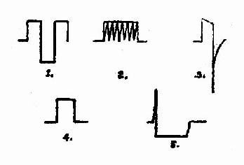 4.电流形态不统一,目前常用有以下几种波形:(1)对称的双向方波;(2)被单向方波调制的中或高频电流;(3)有对称的双向脉冲;(4)单向方波;(5)另一种不对称的双向脉冲,图3.3.7。