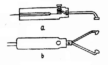 电极 刺激电极有单头和双头两种(图3.2.3)。单头电极(主电极)是一个绝缘手柄上装着一个直径约1cm的圆形金属头,上包5~6层纱布,手柄上装着手动断续器。双头电极是在附有断续器的绝缘手柄上,装上彼此分开的、可以任意调节距离的两个等大的(直径约1cm)或一大一小的刺激电极。