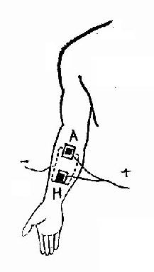 (一) 肾上腺素组织胺导入试验 两个小电极和一个大电极放置在右侧前臂上(图2.2.1),A电极衬垫用0.01%盐酸肾上腺素液浸湿,而H电极用0.01%磷酸组织胺液浸湿,都连阳极。右臂伸侧电极衬垫用肾上腺素或组织胺液浸湿,连阴极,通电10分钟后,取下电极观察局部皮肤。A电极下皮肤出现苍白斑点,提示肾上腺素已进入体内并引起反应;H电极下皮肤明显充血、水肿,出现荨麻疹,证明组织胺已进入人体,右臂伸侧电极下皮肤则元些反应,表示药物没有进入皮肤。