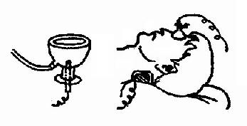 (二) 电水浴法 将药液放在水槽内,一般用炭质电极,治疗部位浸入槽内;非作用极用衬垫电极置于身体相应部位(图2.2.12)。也可将四肢远端分别浸入四个水槽内,根据导入药液性质分别连阴极或阳极,称为四槽浴直流电药物导入法。治疗眼部疾病可采用眼杯法(图2.2.13)。眼杯固定于眼部,盛满药液,插入白金电极,非作用极用衬垫电极60cm2置于杯部,电流强度每只眼1~2mA。
