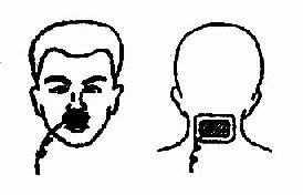 2. 鼻粘膜疗法:将药液浸湿的棉条塞入鼻腔,使其紧贴鼻粘膜,在鼻唇沟处放一小块绝缘布,将露出鼻腔外的棉条置于其上面,再放一个1.5×3cm2的铅片,亦可用棉条包绕导线末端,非作用极60cm2置于枕部(图2.2.14)。反射治疗时,电流强度从0.5mA开始,逐渐增加至2~3mA。