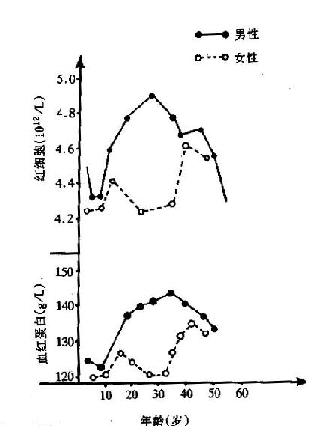 (1)年龄与性别的差异:初生儿由于在母体内以弥漫方式从母体血液获得氧气,通常处于生理性缺氧状态,故红细胞明显增高,但在出生2周后就逐渐下降。男性儿童在6-7岁时最低,随着年龄增大而逐渐上升,到25-30岁时达高峰,30岁后随年龄的逐渐下降,直到60岁时尚未停止。在女性儿童也随年龄增大逐渐增长,到13-15岁时达最高值,而后帽于月经内分泌等因素影响逐渐下降,到21-35岁维持最低水平后又逐渐升高与男性水平相近(图2-1)