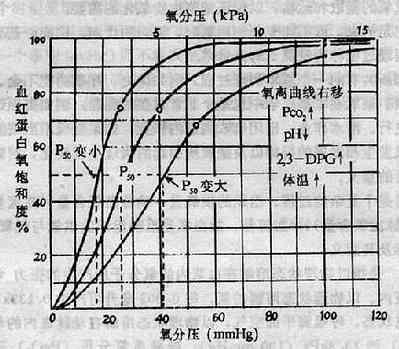 中间曲线为标准状态下(38℃、PCO2 5.32kPa(40mmIIg)、pH7.4)的氧离曲线,P50约3.59kPa (27mmHg)