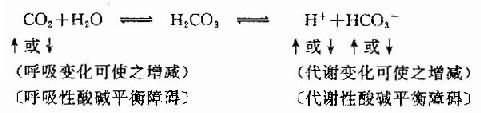 上述三种定义看起来是不同的,甚至截然相反,但是又都在使用。它们繁简不同地都可解释酸碱平衡障碍,其间的关系如何,便需说明。下列一个重要的化学缓冲反应式可以帮助说明: