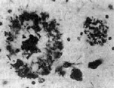 左侧为典型的老年斑。中心为嗜银团,围以空晕,外围为嗜银性细颗粒及细丝,周围见星形胶质细胞。右侧见一正在形成的老年斑