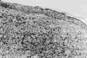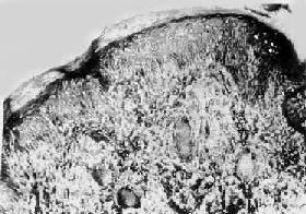 镜下,病灶为由多量泡沫细胞(foamy cell)组成的肉芽肿,夹杂有少量淋巴细胞。泡沫细胞来源于巨噬细胞,在吞噬麻风杆菌后,麻风杆菌的脂质聚集于巨噬细胞浆内,乃使后者呈泡沫状。抗酸染色可见泡沫细胞内含多量麻风杆菌,甚至聚集成堆,形成所谓麻风球(globus leprosus)。病灶围绕小血管和附件,以后随病变发展而融合成片,但表皮与浸润灶之间有一层无细胞浸润的区域(图18-18),这是结核样型麻风所没有的。由于患者对麻风杆菌的细胞免疫缺陷,病灶内不出现类上皮细胞,淋巴细胞也很少。经治疗病变消退时,麻风杆菌数量减少,形态也由杆状变为颗粒状,泡沫细胞减少或融合成空泡,纤维组织增生。最后病灶消退仅留瘢痕。