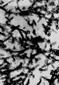 曲菌可在身体许多部位引起病变,如皮肤、耳、鼻腔、眼眶、心、脑、肾、呼吸道、消化道等,而以肺部病变为最常见。曲菌在组织内可引起化脓,形成小脓肿。有时不化脓而发生组织坏死及出血,周围有多数中性粒细胞和单核细胞浸润。在小脓肿和坏死灶内有大量菌丝。曲菌并常侵入血管引起血栓形成,造成血管阻塞,可使组织缺血、坏死。慢性病灶有纤维组织增生,其中有大量淋巴细胞和单核细胞浸润,并杂有多数巨噬细胞和异物巨细胞。病灶内有大量菌丝。曲菌菌丝粗细均匀,直径约2~7μm,有隔,分支状,常成约45°的锐角分支(图18-33),HE染色呈蓝紫色,PAS染色更为清晰,也可用镀银法显示。在陈旧的纤维肉芽肿性病灶内,曲菌菌丝可变形,粗细不匀,部分可膨大呈球状或小囊状。