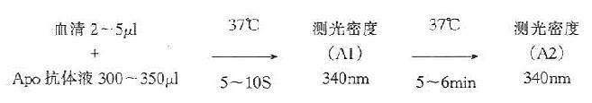 (5)说明:①Apo测定的光密度从340~700nm范围都可采用,多用340nm;②国内已有的Apo试剂盒均无需处理;③血清标本也无需处理,均可直接检测;④本法适用于多种类型的全自动生化分析仪检测,自动扣除空白,快速准确;⑤效价不同的抗血清,其用量应作适当的调整。