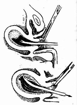 4.用窥器暴露宫颈,根据子宫位置用组织钳钳夹宫颈前唇或后唇,再以碘酒、酒精消毒宫颈及阴道穹窿。用子宫探针顺子宫方向轻轻探测宫腔深度,然后用扩宫器将宫颈管逐渐扩大至7~8号,便于6~7号吸刮器吸刮时通过。如行搔刮术,应扩大至8~10号,使中号刮匙及小卵园钳能进入宫腔,扩张器要顺宫腔曲度徐徐伸入,在通过宫颈内口后即不要再前进。孕周数较大者,为使宫颈口松驰便于手术,可在术前一天由宫颈口插入一消毒橡皮导尿管或消毒牛夕,次日手术前抽出,操作时应严格无菌技术。
