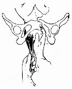 (三)娩出头儿 将手伸入产道,以中指或食、中二指插入儿口,钩住下颌,连牵连将儿面向母体骶凹方向旋转,另一手在耻骨上方按压,助儿头娩出(图238)。有困难时,可用数把组织钳或用有齿长钳夹住儿颈断端,协同牵引,牵出时注意勿使碎骨戳伤产道软组织。