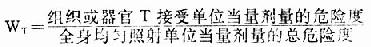 权重因子(weighting factor,WT)是用来表示各组织器官的相对危险度。全身均匀照射的总危险度为165×10-4·Sv-1。则各组织器官的权重因子(WT)为: