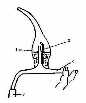 雾化吸入器(图14-11)为一特制玻璃器,其1、2、3、4、5五个管口,在球形器内注入药液,3管口接上氧气,气流自3管冲向4管口出来,不起喷作用,但用中指堵住4管口时,气流即被迫从1管口冲出,2管口附近空气密度突然降低,形成负压,球内药液经4管吸出,当上升到2管口时,又被来自1管口的急速气流吹散,形成雾状微粒从管口喷出。