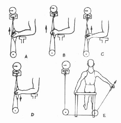 在肌力超过3级时,为了进一步作较细致的定量评定,须用专门器械作肌力测试。根据肌肉的不同的收缩方式有不同的测试方式,包括等长肌力检查、等张肌力检查及等速肌力检查。常用方法如下: