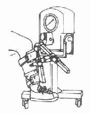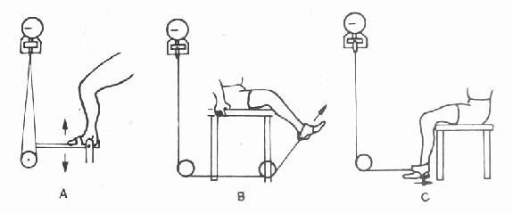 (4)四肢各组肌力测定在标准姿势下通过钢丝绳及滑轮拉动固定的测力计,可对四肢务组肌肉的等长肌力进行各别测定,方法见图2-1-4,2-1-5。这组设备可组合成一架综合测力器,以便使用。