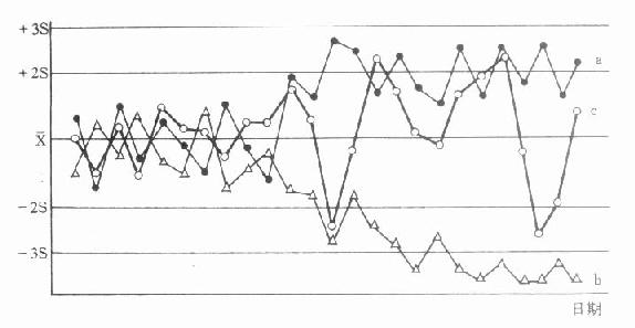 ⑵每天将该批号质量控制血清按有关规定复溶(液体的血清则融化),随同各项目病人标本的测定同时测定一份:并按上述方法画出图上的对应点,用直线将该点与前一天的点连接。如果点在X±3S线以外,则为失控。应立即报告有关负责人,迅速查找原因,必要时复测标本,然后才可发出化验报告,并应对失控情况查找的过程及结果处理等详细记录。如果点在X±2S线以外,或出现连续5点以上在X一侧等规律性变化,均应及时向有关负责人反映,并积极查找原因。但当天的化验报告一般可以发出。