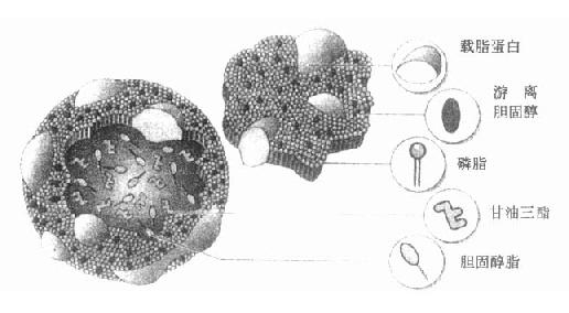 一般认为血浆脂蛋白都具有类似的结构,呈球状,在颗粒表面是极性分子,如蛋白质,磷脂,故具有亲水性;非极性分子如甘油三酯、胆固醇酯则藏于其内部。磷脂的极性部分可与蛋白质结合,非极性部分可与其它脂类结合,作为连接蛋白质和脂类的桥梁,使非水溶性的脂类固系在脂蛋白中。磷脂和胆固醇对维系脂蛋白的构型均具有重要作用。