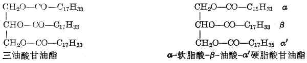 R1、R2及R3分别代表三分子脂肪酸的羟基,根据它们是否相同将脂肪分成单纯甘油酯和混合甘油酯两类。如果其中三分子脂肪酸是相同的,构成的脂肪称为单纯甘油酯,如三油酸甘油酯。如果是不同的,则称为混合甘油酯,如α-软脂酸-β-油酸-α'-硬脂酸甘油酯。人体的脂肪一般为混合甘油酯,所含的脂肪酸主要是软脂酸和油酸。