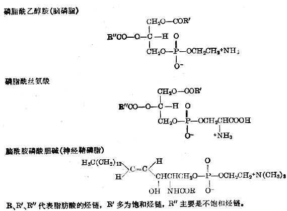 (3)磷脂的种类 磷脂是包括各种含磷的脂类。它们在自然界的分布很广,种类繁多。按其化学组成大体上可分为两大类。一类是分子中含甘油的称为甘油磷脂,另一类是分子中含神经氨基醇的称为神经磷脂。甘油磷脂又按性质的不同再分为中性甘油磷脂和酸性甘油磷脂两类。前者如磷脂酰胆碱(卵磷脂)、磷脂酰乙醇胺(脑磷脂、缩醛磷脂)、溶血磷脂酰胆碱等;后者如磷脂酸、磷脂酰丝氨酸、二磷脂酰甘油(心磷脂)等。神经磷脂中的神经氨基醇是一系列碳链长度不同的不饱和氨基醇,其中最常见的是含18个碳原子,在磷脂中常以酰胺即脑酰胺形式存在,如脑酰胺磷酸胆碱(神经磷脂、鞘磷脂)、脑酰胺磷酸甘油等。将其中几种主要的磷脂结构列述于下: