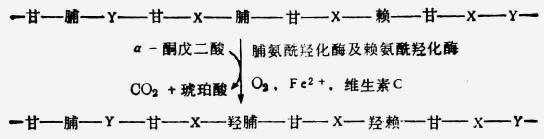 此羟化过程需要氧、铁及维生素C0维生素C有激活此类酶的作用,因此,维生素C缺乏将使胶原蛋白合成发生障碍,导致结缔组织形成不良,血管脆性增加乃至出血,即出现坏血病的一系列症状和体征。