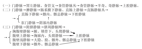(一)门静脉→胃左静脉、食管支→ 食管静脉丛→食管静脉→半奇、奇静脉→上腔静脉。