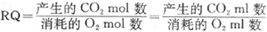 呼吸商 机体依靠呼吸功能从外界摄取氧,以供各种营养物质氧化分解的需要,同时也将代谢终生物CO2呼出体外,一定时间内机体的CO2产量与耗氧量的比值称为呼吸商(respiratory quotient, RQ)。各种营养物质在细胞内氧化供能属于细胞呼吸过程,因而双将各种营养物质氧化时的CO2产量与耗氧量的比值称为某物质的呼吸商。严格说来,应该以CO2和O2的克分子(mol)比值来表示呼吸商。但是,因为在同一温度和气压条件下,容积相等的不同气体,其分子数都是相等的,所以通常都用容积数(ml或L)来计算CO2与O2的比值,即: