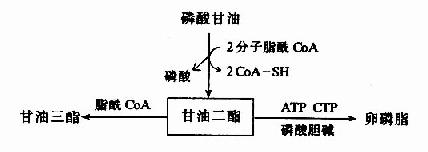 肝脏还是合成磷脂的重要器官。肝内磷脂的合成与甘油三酯的合成及转运有密切关系。磷脂合成障碍将会导致甘油三酯在肝内堆积,形成脂肪肝(fatty liver)。其原因一方面由于磷脂合成障碍,导致前β脂蛋白合成障碍,使肝内脂肪不能顺利运出;另一方面是肝内脂肪合成增加。卵磷脂与脂肪生物合成有密切关系。卵磷脂合成过程的中间产物——甘油二酯有两条去路:即合成磷脂和合成脂肪,当磷脂合成障碍时,甘油二酯生成甘油三酯明显增多。