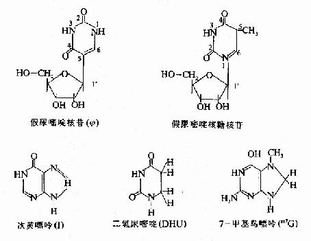tRNA(transfer RNA)是蛋白质合成中的接合器分子。tRNA分子有100多种,各可携带一种氨基酸,将其转运到核蛋白体上,供蛋白质合成使用。tRNA是细胞内分子量最小的一类核酸,由70~120核苷酸构成,各种tRNA无论在一级结构上,还是在二、三级结构上均有一些共同特点。tRNA中含有10%~20%的稀有碱基(rare bases),如:甲基化的嘌呤mG、mA,双氢尿嘧啶(DHU)、次黄嘌呤等等。此外,tRNA内还含有一些稀有核苷,如:胸腺嘧啶核糖核苷,假尿嘧啶核苷(Ψ,pseudouridine)等。胸腺嘧啶一般存在于DNA中;在假尿嘧啶核苷中,不是通常嘧啶环中1位氮原子,而是嘧啶环中的5位碳原子与戊糖的1′位碳原子之间形成糖苷键。