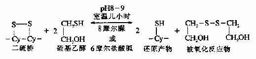 利用还原剂巯基乙醇亦可使蛋白质的-S-S-断裂。当高浓度的巯基乙醇在pH8?条件下室温保温几小时后,可以使-S-S-定量还原为桽H。与此同时反应系统中还需要有8摩尔脲或6摩尔盐酸胍使蛋白质变性,多肽链松散成为无规则的构型,此时还原剂就可作用于-S-S-。此反应是可逆的,因此要使反应完全,疏基乙醇的浓度必需在0.1-0.5摩尔。