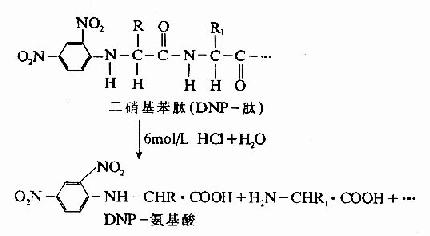 DNP-氨基酸用有机溶剂抽提后,通过层析位置可鉴定它是何种氨基酸。Sanger用此方法测定了胰岛素的N末端分别为甘氨酸及苯丙氨酸。