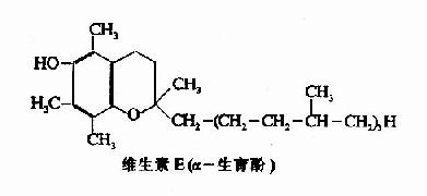 维生素E又称为生育酚,已经发现的生育酚有α、β、γ和δ四种,其中以α-生育酚的生理效用最强。它们都是苯骈二氢吡喃的衍生物。α-生育酚的结构如下:
