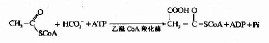 乙酰CoA由乙酰CoA羧化酶(acetyl CoA carboxylase)催化转变成丙二酰CoA(或称丙二酸单酰CoA)反应如下: