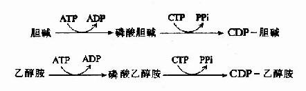 这两种磷脂生成是由活化的CDP胆碱与CDP-乙醇胺和甘油二脂生成。此外磷脂酰乙醇胺在肝脏还可由与腺苷蛋氨酸提供甲基转变为磷脂酰胆碱。