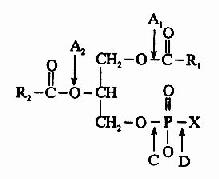 在生物体内存在一些可以水解甘油磷脂的磷脂酶类,其中主要的有磷脂酶A1、A2、B、C和D,它们特异地作用于磷脂分子内部的各个酯键,形成不同的产物。这一过程也是甘油磷酯的改造加工过程。