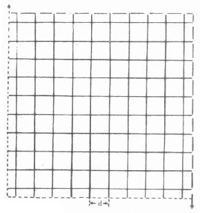 用网格测量的具体操作举例:图9-4为一关联方测格,由于测点、测线、测面之间有互相关联的关系,故称为关联方测格。方格直线交叉称为测点,总数为100个,方格中所有直线称为测线,小方格边长为d如图中所示,测线总长度为200d,整个大方格为测面,测面总面积为100d2,测格周围的虚线不是测线。关联测格的优点是:只在计数位于欲测图像中的测点数P,就可计算位于该图像中的测线长度L及测面的面积A。计算方法为:L=2d·P,A=d2·P。