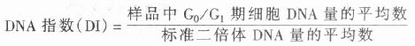 (2)DNA指数:由于DNA的非整倍体细胞是肿瘤的特异性标志已经得到肿瘤学界的公认,在些学者提出建议采用流式细胞术DNA分级指数(Flow cytometry DNA Crading Index, 简称DNA指数或DI)表示DNA含量的异常程度。根据1984年国际分析细胞学会名词审定委员会的规定: