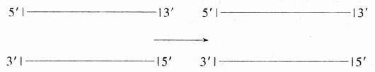 垂直虚线表示中心对称轴,从两侧“读”核苷酸顺序都是GAATTC或CTTAAG,这就是回文顺序(palindrome)。实线剪头表示在双链上交错切割的位置,切割后生成5’……G和AATTC……3’、3’……CTTAA和G……5’二个DNA片段,各有一个单链末端,二条单链是互补的,可通过形成氢键而“粘合”。另一种是在同一位置上切割双链,产生平头末端。例如HaeⅢ的识别位置是: