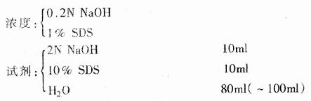 (3)加入5.0ml 2mol/L的NaOH。摇动小管使DNA悬浮、溶解,将小管置50℃15min助溶;