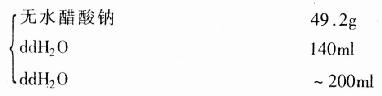 配制:按上述配方,先以少许DEPC水溶解NaCl,然后加入三乙醇胺及浓HCl。DEPC水定容至约1000ml(997.5ml),临用前,一边摇动溶液一边加入醋酸酐,充分混合。注意操作时避免浓HCl 溅出,最好在通风条件下进行。