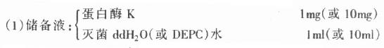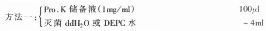 1.蛋白酶(Proteinawe K, Pro.K) 蛋白酶K主要用于杂交前标本处理,其作用是使组织达到一定消化,利于检测分子的穿透,从而提高检测方法的敏感性,但各种组织在不同条件下消化程度不一,因此,具体应用时,应根据组织种类、温度确定反应时间及酶的浓度。过度消化可使组织形态结构遭到明显破坏,核酸分子也会受到影响。通常是将其配成储备液(1mg/ml),临用前,再配成工作液(约0.025mg/ml)。配制方法: