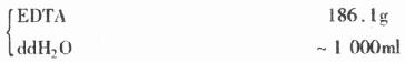 称取EDTA溶于约600ml ddH2O中,常需60℃持续搅拌以助溶,滴加NaOH至pH接近8.0时,EDTA才开始溶解。待完全溶解后,冷却至室温,NaOH调pH至8.0,ddH2O定溶至1000ml,高压灭菌,室温备用。
