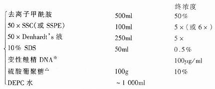 配制:先以去离子甲酰胺与SSC于室温混合,加入硫酸葡聚糖于50℃促溶,依次加入其它成份。硫酸葡聚糖在室温常需数小时才能完全溶解。有时需旋涡振荡。定容后充分混合。根据使用方便可分装(最好用铝箔将瓶子包好)存于4℃,可达数月。注意,杂交缓冲液在使用前切忌污染。