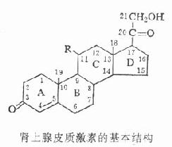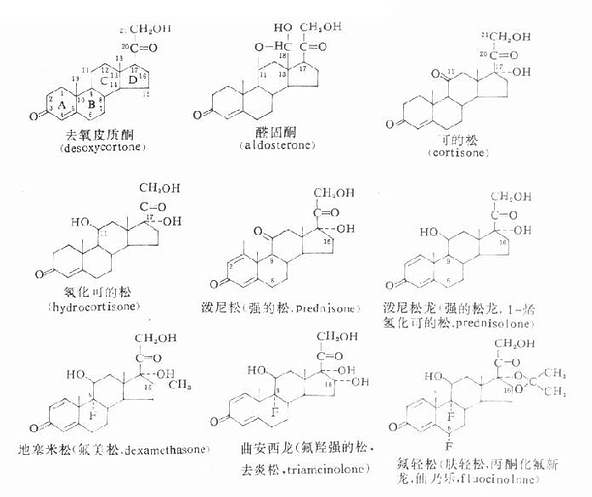 肾上腺皮质激素(adrenocortical hormones)是肾上腺皮质所分泌的激素的总称,属甾体类化合物。可分为三类:①盐皮质激素(mineralocorticoids),由球状带分泌,有醛固酮(aldosterone)和脱氧皮质酮(desoxycortone,desoxycorticosterone)等。②糖皮质激素(glucocorticoids),由束状带合成和分泌,有氢化可的松(hydrocortisone)和可的松(cortisone)等,其分泌和生成受促皮质素(ACTH)调节。③性激素,由网状带所分泌,通常所指肾上腺皮质激素,不包括后者。临床常用的皮质激素是指糖皮质激素。